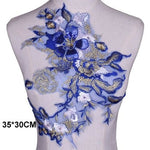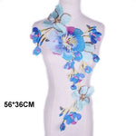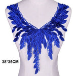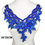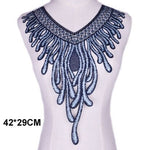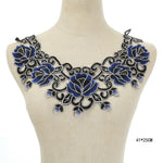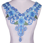 Cette pièce de broderie est travaillée sur une base en tissu polyester de couleur. Selon le modèle, le dos et le devant peuvent comporter des éléments différents. Pour coller ce cache décolleté bleu à votre vêtement, il suffira de coudre l’encolure au tissu.